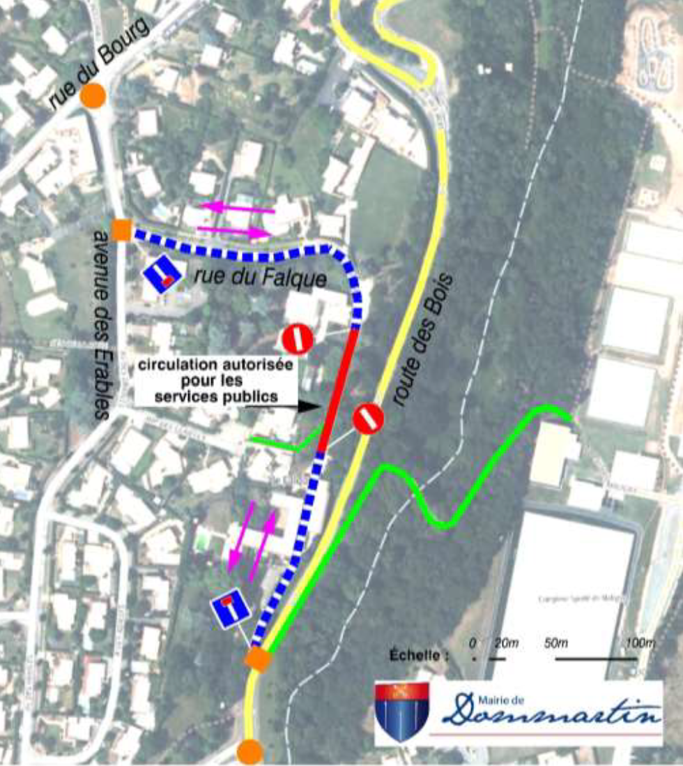 ๐ง Principaux aménagements * Fermeture du tronçon central à la circulation automobile (réservé aux modes actifs). * Le haut et le bas de la rue deviendront chacun une impasse avec circulation à double sens pour les véhicules. * Création d'un cheminement modes actifs sécurisé de 3 m entre la rue du Bourg et la rue des Érables. * Réagencement du carrefour Avenue des Érables / rue du Falque. * Mise en place d'un giratoire au carrefour rue du Bourg / rue du Falque. * Plateau surélevé sur la route des Bois (aménagement déjà réalisé). * Installation de barrières pivotantes pour accès réservé aux services publics sur le tronçon central. * Zone 20 km/h sur la partie basse de la rue du Falque avec voie partagée. * Insertion d’un arrêt de bus dans l’aménagement proche de la rue du Bourg.